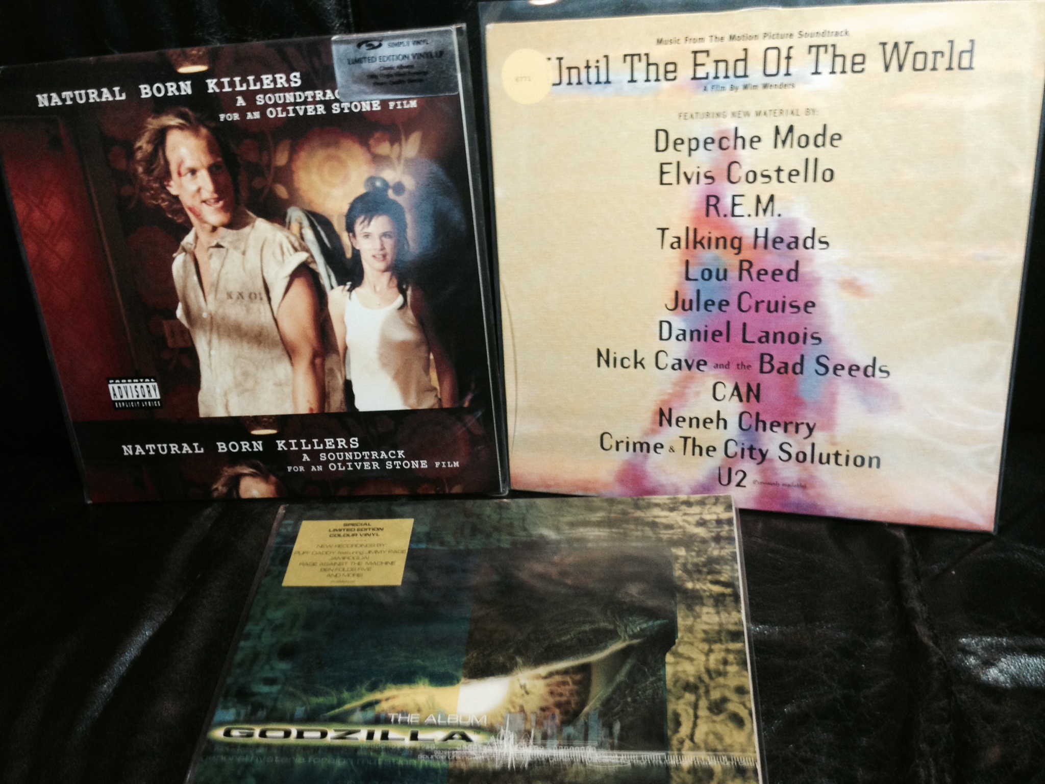サントラつながりで、この当たりも。 写真左上はオリバー・ストーンの『ナチュラル・ボーン・キラーズ』94年 英盤。ナイン・インチ・ネイルズのトレント・レズナーのプロデュース。 英SIMPLY VINYL社製。シンプリー・ビニールはほとんど売っぱらったがこ の1枚だけは残してある。レズナーの凄さを認識した1枚。 右上ヴィム・ヴェンダーズ『アンティル・ジ・エンド・オブ・ザ・ワールド』 91年ドイツ盤(発売は92年1月の模様)。選曲、曲順が素晴らしく、聴い ているとロード・ムービーならではの情景が目に浮かぶ名サントラ。ジャ ケに記載されたこの顔ぶれをご覧いただきたい。デザイン違いのEU盤もある。 写真下が悪名高き98年のトカゲゴジラのサントラ。何盤か記載なし。 ジミー・ペイジが「カシミール」のリフを弾いている、というだけのために ZEPファンは泣く泣く買う(ま、それなりにカッコいいトラックになってるが)。 盤は変な緑色(全然ゴジラじゃねえよ)。 その他『トレインスポッティング』のサントラも人気があるようだ。![]()